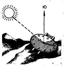 одну палатку; костровое оборудование (таганок в чехле, пила в чехле, большой и маленький топоры в чехлах, спички в непромокаемой упаковке); кухонное оборудование (ведра плоские в чехлах); маршрутные документы и оборудование (карты маршрута —2 экз., компасы —2 шт., групповые деньги, ремонтный набор, аптечка). Примерный список личного снаряжения: рюкзак большой с широкими лямками и поясным ремнем; запасная обувь (кроссовки); куртка с капюшоном (штормовка); легкий головной убор (шапочка); две пары носков; полиэтиленовая накидка от дождя; кружка, ложка, миска, складной нож; фляжка для питьевой воды. Правильно подобранный набор личного снаряжения не должен превышать по весу 6—8 кг. Далее необходимо потренироваться в правильной укладке рюкзака. Вначале в рюкзак вкладывают большой полиэтиленовый пакет (вкладыш) для предохранения содержимого рюкзака от влаги. Затем внутрь вкладыша к спине укладывают мягкие вещи, далее — тяжелые: консервы, сахар, крупы. Сверху продуктов и в карманы рюкзака укладывают вещи, которые могут понадобиться во время движения по маршруту. Личное снаряжение раскладывают в матерчатые или непромокаемые мешки, группируя их применительно к использованию. Правильно уложенный рюкзак должен хорошо прилегать к спине вогнутой стороной. Далее следует потренироваться в определении сторон горизонта по солнцу и часам. Этот способ дает удовлетворительные результаты зимой. Летом, особенно в южных широтах, ошибки могут достигать более 25°. Для определения сторон горизонта по солнцу и часам наручные часы держат горизонтально (рис. 1). Часовую стрелку направляют на солнце. Угол между часовой стрелкой и цифрой 12 (если часы установлены по местному времени), цифрой 1 (если часы установлены по декретному времени, период октябрь—апрель), цифрой 2 (если часы установлены по летнему времени, период апрель — октябрь) разделить пополам. Биссектриса угла, образованного между часовой стрелкой и цифрами Рис. 1. Ориентирование на местности 12, 1, 2, соответственно покажет на- по часам и солнцу