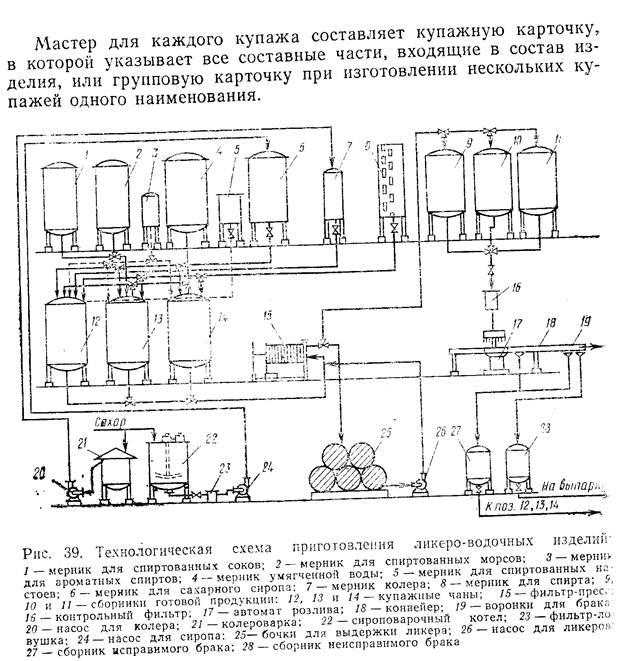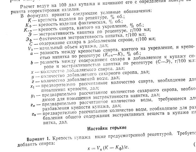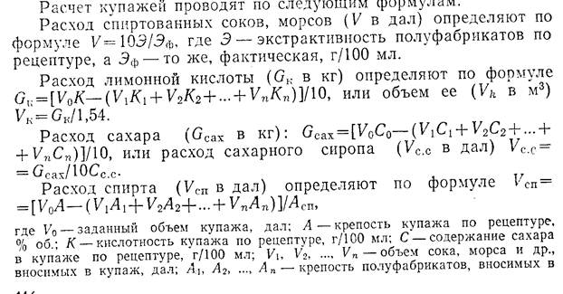 Купажирование напитков. Процесс приготовления изделий путем смешивания отдельных составных частей его называется купажированием, а полученная смесь — купажом. Приготовление купажа — основная операция технологического процесса, от тщательности выполнения которой во многом зависит качество изделий. Перед купажированием плодово-ягодные соки и морсы осторожно сливают с осадка, образовавшегося на дне чана в процессе их хранения, и пропускают через фильтр-прессы. При необходимости плодово-ягодные соки и морсы перед фильтрованием осветляют бентонитом. Лимонную кислоту перед введением в купаж растворяют в воде. Эфирные масла и ванилин вносят в виде спиртованных растворов; красители индигокармин и тартразин предварительно растворяют в воде или в пробе, отобранной из купажа изделия. Колер перед внесением в купаж разбавляют водой (на 1 кг колера 1 л воды). Сахарный сироп перед введении в купаж должен быть охлажден до 20 °С во избежание испарения спирта и ароматических веществ. Ликеро-водочные изделия приготовляют по действующим рецептурам. Готовые изделия должны удовлетворять установленным для них аналитическим показателям (содержание спирта, сахара, экстракта, кислотность и цветность) и органолептическим (цвет, вкус и аромат). В рецептуре на каждое изделие приведен расход полуфабрикатов на 1000 дал, причем для изделий, приготовляемых на плодово-ягодном сырье, указано также количество общего экстракта (в килограммах), а для изделии из эфиромасличного сырья — количество эфирного масла (в литрах). В рецептурах также указан расход сырья (в килограммах) Для приготовления 1000 дал изделия. Расход сырья в полуфабрикатов приведен из расчета на сырье среднего качества. Обычно состав сырья и полуфабрикатов, имеющихся на заводе, несколько отличается от принятого в рецептуре. Поэтому прежде, чем приступать к приготовлению купажа, производят расчет их необходимого количества, исходя из фактического содержания в них экстрактивных веществ, сахара, кислот, эфирных масел, спирта. Расчет купажей. При расчете руководствуются нормами расхода, указанными в рецептурах, и фактическим качеством сырья и полуфабрикатов. При расчете купажей необходимо учитывать следующее: содержание экстракта, указанное в аналитических показателях изделия (суммируется из содержания экстрактивных веществ, вносимых в купаж со спиртованными соками, морсами, сахаром и лимонной кислотой); содержание сахара, указанное в аналитических показателях (суммируется из содержания сахара, вводимого со спиртованными соками и морсами, и содержания сахара в сахарном сиропе); содержание кислоты [суммируется из содержания кислоты в спиртованных соках и морсах, лимонной кислоты, пошедшей на доведение кислотности изделия до указанной в рецептуре, и лимонной кислоты, пошедшей на инверсию сахара при применении сахарного сиропа концентрацией 73,2 %]. При наличии на заводе полуфабрикатов и сырья с пониженной зкстрактивностью (для плодово-ягодного) или пониженным содержанием эфирных масел (для эфиромасличного) закладка их в купаж должна быть увеличена, а при повышенном содержании —уменьшена. Кроме того, в зависимости от сортности сырья, условий хранения π способа переработки полуфабрикаты могут отличаться один от другого вкусом и ароматом. Поэтому для получения изделий высокого каче