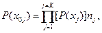 При необходимости количество информации в случайно выбранном сообщении нетрудно связать с информативностью символов кода сообщения. Если процесс образования символов описывается цепью Маркова и символы могут принимать К значений, то найти вероятность возникновения сообщения Р (x 0 j)можно как произведение вероятностей возникновения символов его кода. Если они выбираются независимо и символ типа j встречается nj раз, то вероятность возникновения сообщения x 0 j, составит