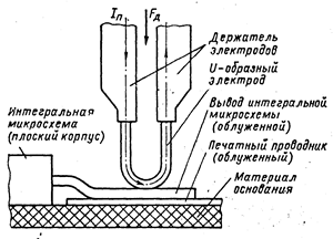 Пайка сдвоенным электродом аналогична сварке сдвоенным электродом (см. рис. 2.4). В этом способе производится последовательная пайка каждого вывода электронного компонента в отдельности. Отличие состоит в том, что при пайке на контактируемую поверхность предварительно наносится доза припоя, рабочая температура и, следовательно, электрическая мощность ниже, чем при сварке, так как не требуется расплавлять контактируемые материалы. Принцип пайки V-образным электродом показан на рис. 2.14. При этом за один рабочий ход производится одновременная пайка выводов ИМ с одной, двух, либо четырех сторон (в зависимости от оборудования).