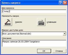 2. Бетбелгі (Закладка) батырмасын сырт еткізіңіз. Экранда (3 сурет) терезе пайда болады, оның ішінде құжаттағы қажетті бетбелгіні тауып, Жарайды (ОК) батырмасын сырт еткізіңіз. Гиперсілтемені кәдімгі мәтінге түрлендіріу. Ол үшін төмендегі әрекеттерді орындаңыз: · Гиперсілтемеге мәтінді меңзерді қойыңыз; · Ctrl+Shrift+F9 пернелер комбинациясын орындаңыз. Құрамды әмірлер (макростар) Бір әрекеттегі бірнеше рет қайталап орындайтын енгізіу мен мәтінді түзету процесін жеделдету үшін макростарды қолдану тиімді. Макрос дегеніміз – бір команда болып жазылған бірнеше командалардың тізбегі, басқаша атауын – макрокоманда. Макростарда әрекеттердің орындалу барысында тізбектеліп командалар жазылады. Макросқа атау беруге болады, пернелердің тіркесімен, болмаса құрал саймандар панеліндегі батырмамен немесе менюдегі командамен белгілеуге болады. Макросты Word және Visual Basic құралдарымен жасауға болдаы. Word құралдарымен құрамды әмірді жасау. Құрамды әмірді жасау үшін Құралдар =>Құрамды әмір => Жаңа құрамды әмір жазбасы (Начать Сервис => Макрос => Начать запись) командасын орындаңыз. Онан соң Құрамды әмір жазбасы (Запись макроса) терезесі (4 сурет) пайда болады, онда:
