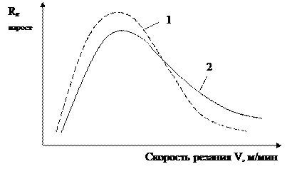 Влияние скорости резания проявляется через изменение температуры в зоне обработки. Температура определяет наростообразование при резании. На рисунке 21 кривая 2 зависимости высоты неровностей Rz от скорости резания повторяет кривую 1 зависимости для нароста. При скоростях малых и больших, когда нарост отсутствует, Rz будет минимальной. Рис.21 Зависимости величин Rz (кривая 2) и нароста обрабатываемого материала (кривая 1) от сложности резания