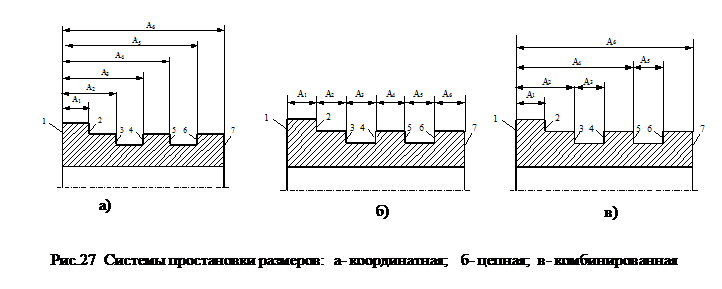 На рис.27в,показана наиболее часто используемая смешанная или комбинированная система простановки размеров. Правила для установления последовательности обработки поверхностей также будут комбинированными: для поверхностей, связанных размерами по координатной системе, последовательность будет определяться по правилам для такой системы, а поверхности, связанные размерами по цепной системе, должны обрабатываться в последовательности, определяемой рекомендациями для цепной простановки. Так, для примера по рис.27в,первой должна обрабатываться поверхность 1; поверхности 2, 3, 5 и 7 могут затем обрабатываться в любой последовательности, поверхность 4должна обрабатываться после обработки поверхности 3, а 6- после 5.