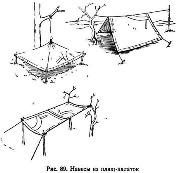 поднимают сшитый намет на три собранные стойки и крайние из них укрепляют оттяжками; растягивают намет и привязывают его концами шнуровочных веревок к приколышам. В жарких районах из плащ-палатки можно соорудить простейшие навесы (рис. 89), которые защитят от палящих лучей солнца и в то же время будут хорошо проветриваемы. В жаркое время не рекомендуется размещаться на отдых в глубоких ямах, впадинах, закрытых машинах, где нет свободной вентиляции воздуха. Не следует размещаться в развалинах, у дувалов, пещер — в таких местах обычно имеется много клещей, укус, которых может вызвать заражение.