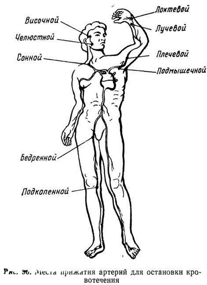 Своевременная и умело оказанная первая медицинская помощь имеет решающее значение для со хранения жизни раненого. Разведчики, действующие в тылу противника, не всегда имеют возможность получить первую врачебную помощь до возвращения в свое расположение; для них тем более важно умение помочь себе и товарищу при ранении или несчастном случае. В разведке с давних пор существует правило — не оставлять раненого товарища на территории противника, использовать все возможности для до» ставки его в свое расположение. Каждому разведчику выдается индивидуальный перевязочный пакет и индивидуальная аптечка. Индивидуальный перевязочный пакет состоит из бинта и двух ватно-марлевых подушечек, одна из которых свободно передвигается по бинту. При ранении нужно осторожно, но быстро, не причиняя боли раненому, обнажить рану и осмотреть ее. Не следует трогать рану руками, обмывать ее водой, извлекать осколки, обрывки одежды и другие инородные предметы. На рану накладывается стерильная повязка, используя для этого индивидуальный перевязочный пакех или любую чистую материю. При н а л о ж е н и и повязки нужно следить, чтобы та часть тела раненого, которая бинтуется, была неподвижна. Бинт развертывается в одном направлении и накладывается снизу вверх, перекрывая каждым витком не менее половины предыдущего. Разворачивая пакет, нельзя касаться руками той стороны подушечки, которая будет наложена на рану. Если ранение сквозное, одну из подушечек нужно накладывать на входное, а другую на выходное отверстие и обе крепко прибинтовать. При проникающем ранении трудной клетки нужно сначала наложить на рану прорезиненную оболочку перевязочного пакета внутренней стороной, затем на нее наложить подушечки и туго забинтовать. При ранении особую опасность для жизни человека представляет артериальное кровотечение. Для остановки кровотечения нужно сильно прижать пальцами к кости соответствующую артерию (рис. 96), поднять раненую конечность и положить на нее жгут, закрутку или давящую повязку. Жгут или закрутка накладывается на бедро, голень, плечо или предплечье выше (нейтральнее) места ранения, по возможности ближе к нему (рис. 97). При этом можно использовать брючный ремень, полотенце, рукав рубашки, кусок ткани и др. Нельзя накладывать жгут на голое тело, нужно подложить под него одежду, бинт, вату и т. п. Обязательно следует отметить время наложения жгута (закрутки). Жгут или закрутку нельзя закрывать бинтом. Транспортировать раненого с наложенным жгутом нужно в лежачем положении, Если раненого невозможно эвакуировать сразу, то во избежание омертвения или паралича конечности жгут нужно периодически ослаблять (летом через 2 часа, зимой через час). При ослаблении следует прижать артерию, конечность слегка