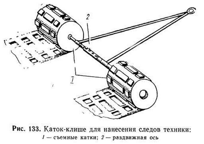 Навыки в следопытстве совершенствуются и развиваются постоянно в ходе занятий и в повседневной жизни. Занятия по следопытству требуют наличия соответствующей учебной материальной базы, как стационарной, так и переносной, рисунков и отпечатков следов, катков-клише для нанесения следов на местности (рис. 133), набора предметов солдатского обихода, листов из иностранных журналов и газет, раз-личных указателей, консервных банок и др. Этот "реквизит» может использоваться на любых занятиях по тактической подготовке. Занятия по следопытству проводятся, как правило, в составе взвода. Показ и изучение приемов и правил следопытства командир взвода проводит со всем личным составом одновременно, а тренировки — по отделениям на учебных точках. В процессе боевого слаживания отделений и взвода его командир должен постоянно включать вопросы следопытства при отработке различных тем Кроме того, и вне занятий следует напоминать личному составу важность внимательного отношения к следам. Например, после привала, перерыва на занятиях командир дает задание по оставленным на месте отдыха приметам (окуркам, кострам, местам стоянки техники, примятой траве, остаткам пищи и т. п.) доказать, кто, когда и сколько времени находился на этом