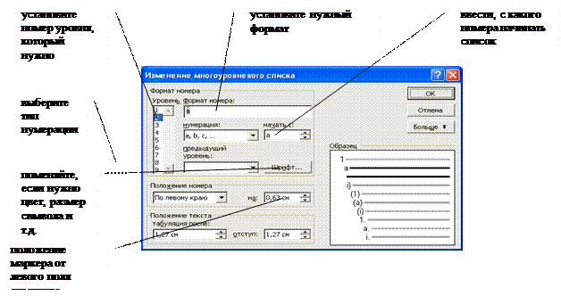 Что бы создать многоуровневый список, после выделения строк выберите команду Формат – Список – Многоуровневый и выберите стиль списка из предложенных вариантов. Если из предложенных вариантов нет ничего подходящего, то нажмите Изменить и следуйте рекомендациям (рис. 36).