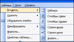 Шаблоны оформления таблицы. Копирование элементов таблицы. Удаление элементов таблицы. Удаление содержимого ячеек. Вставка, удаление, копирование таблицы и элементов таблицы. 1) Общее правило вставки в таблицу новых элементов заключается в том, что перед вставкой новой ячейки, строки или столбца нужно сначала выделить существующую ячейку, строку или столбец, а затем выполнить команду Таблица – Вставить. Затем в появившемся меню выбрать необходимые действия (рис. 44).