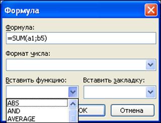 · если в поле Формула предложена неподходящая формула, удалите ее; · в списке Вставить_функцию выберите нужную функцию. Например, для сложения чисел выберите SUM; · введите в формулу адреса ячеек. Например, для суммирования содержимого ячеек a1 и b4 введите формулу =SUM(a1;b4);