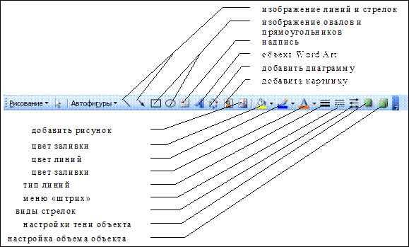 Рисунок Microsoft Draw. Рисунок можно сделать в любом графическом редакторе и затем перенести в Word с помощью буфера обмена. Можно также воспользоваться встроенным в Word простым графическим редактором – программой Microsoft Draw. Для того чтобы перейти в режим редактора Microsoft Draw выполните команду Вставка –Объект – Рисунок Microsoft Word. Когда рисунок готов, надо настроить его размер и затем вернуться в документ: 1) Найдите панель инструментов Изменение рисунка ( 2) На панели инструментов Изменение рисунка нажмите кнопку Восстановить границы рисунка. 3) На панели инструментов Изменение рисунка нажмите кнопку Закрыть рисунок (или выберите команду Файл - Закрыть и вернуться). 4) В документе Word отцентрируйте рисунок. Чтобы создать простейший рисунок или схему в вашем документе выберите свободное место и нажмите кнопку вызова панели инструментов рисования