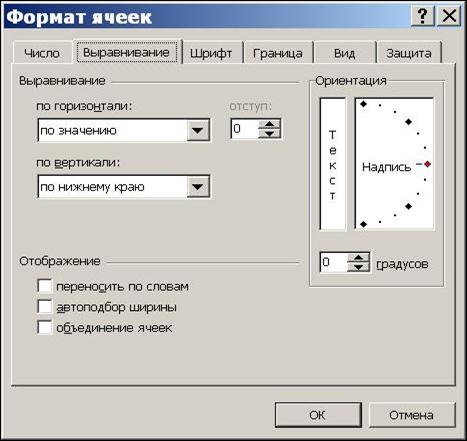 Текстовый процессор Word специализирован для работы с текстами. Поэтому он имеет более широкий набор инструментов для форматирования текста, чем табличный процессор Excel. Тем не менее, Excel имеет достаточно средств для подготовки и печати профессионально оформленных документов. Ввод коротких текстов (записей, заголовков и т.д.), чаще всего, требует двух видов форматирования: выравнивания по горизонтали и выравнивания по вертикали. Эти операции выполняются через меню Формат→Ячейки....