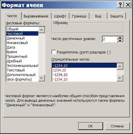 Основными операциями форматирования чисел являются: задание количества знаков в десятичной части; выравнивание по правому краю и отступ справа. Числа выравниваются по правому краю по умолчанию, однако в некоторых случаях для этой цели можно использовать соответствующую кнопку на стандартной панели инструментов. Количество знаков в десятичной части числа задается на вкладке "Число" окна "Формат ячейки". При выборе числового формата "Числовой" окно принимает вид, показанный на рисунке 71.