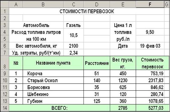 Формула для вычисления стоимости перевозки до Корочи в ячейке F9 имеет вид: =$F$4*$C$4*E9/100+$C$7*D9*($C$6+E9)/1000