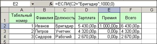 Задание 1: Подсчитайте зарплату сотрудникам автопредприятия. Если сотрудник бригадир у него премия − 1000 рублей, остальным премия не назначается (рис.81). Технология работы: