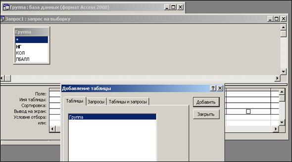 Рисунок 119 - Создание запроса на выборку: окно Добавление таблицы 4. В оставшемся окне Запрос_на_выборку щелкните верхнюю левую ячейку, относящуюся к заголовку Поле. В данной ячейке должен появится значок всплывающего меню. Используя его, введите в ячейку имя первого поля создаваемого запроса − НГ. 5. Аналогичным образом заполните остальные ячейки первой строки (КОЛ, ПБАЛЛ). 6. Установите сортировку по полю КОЛ. 7. В строке условие отбора внесите критерий отбора: в поле КОЛ введите >30. 8. В строке Вывод_на_экран значок «галочка» означает, что в результате выполнения запроса данное поле будет выводиться на экран (рисунок 120).