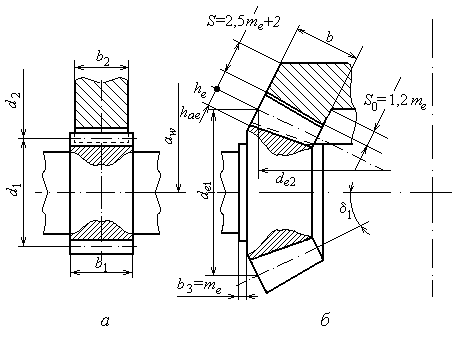 Рис. 3.2 1. Намечают расположение проекций компоновки в соответствии с кинематической схемой привода и наибольшими размерами колёс. 2. Проводят оси проекций и осевые линии валов. В цилиндрическом редукторе оси валов проводят на межосевом расстоянии параллельно друг другу, в коническом – под углом 90°. 3. Вычерчивают зубчатую передачу в соответствии с геометрическими параметрами шестерни и колеса, полученными в результате проектного расчёта. Места зацепления колёс показывают в соответствии с рис. 3.3: а – передача цилиндрическая; б – коническая.