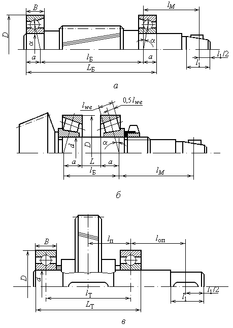 4. Для предотвращения задевания поверхностей вращающихся колёс за внутренние стенки корпуса контур стенок проводят с зазором = 8…10 мм. Расстояние hM (рис. 3.2) между дном корпуса и поверхностью вершин зубьев колёс для всех типов редукторов принимают hM 4 (с целью обеспечения зоны отстоя масла). Действительный контур корпуса редуктора зависит от его кинематической схемы, размеров деталей передач, способа транспортировки, смазки и тому подобного и определяется при разработке конструктивной компоновки. 5. Вычерчивают ступени вала на соответствующих осях в соответствии с геометрическими размерами d и l, полученными в проектном расчёте валов (см. табл. 3.1), и графическим определением конструкции валов для цилиндрического редуктора (см. рис. 3.2). Ступени валов вычерчивают в последовательности от 3-й к 1-й. При этом длина 3-й ступени l 3 получается конструктивно как расстояние между противоположными стенками редуктора или равное длине ступицы колеса. 6. На 2-й и 4-й ступенях вычерчивают контуры подшипников по размерам d, D, B (T, С) в соответствии со схемой их установки (см. табл. 3.2). Для конических роликоподшипников h = (D − d) / 6. Контуры подшипников проводят основными линиями. 7. Определяют расстояния l Б и l Т между точками приложения реакций подшипников быстроходного и тихоходного валов. Радиальную реакцию подшипника считают приложенной в точке пересечения нормали к середине поверхности контакта наружного кольца и тела качения подшипника с осью вала (рис. 3.4): а) для радиального подшипника точка приложения реакции лежит в средней плоскости подшипника, а расстояние между реакциями опор вала б) для радиально-упорных шарикоподшипников и конических роликовых точка приложения реакции смещается от средней плоскости подшипника и её положение определяется расстоянием a, измеренным от широкого торца наружного кольца (см. рис. 3.4, а, б):
