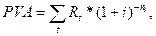 где FVA – наращенная сумма потока платежей; Rt – размер члена ренты, т.е.размер очередного платежа по ренте; i – годовая процентная ставка, по которой на платежи начисляются сложные проценты; n – срок реализации ренты в годах; nt – сроки платежей по ренте. Современная (текущая) стоимость потока платежей (капитализированная или приведенная стоимость) – это сумма платежей, дисконтированных на момент начала ренты по ставке начисляемых сложных процентов, может быть рассчитана по следующей формуле прямого счета: