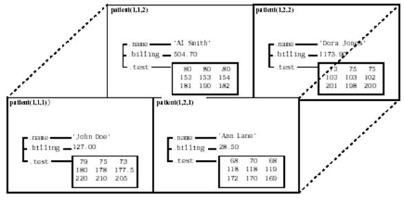 Многомерные массивы структур явлеются распространением обычных двумерных, то есть плоских структур. Подобно другим типам многомерных массивов, вы можете строить их как прямым присваиванием, так и применением функции cat. patient(1,1,1).name = 'John Doe'; patient(1,1,1).billing = 127.00; patient(1,1,1).test = [79 75 73; 180 178 177.5; 220 210 205]; patient(1,2,1).name = 'Ann Lane'; patient(1,2,1).billing = 28.50; patient(1,2,1).test = [68 70 68; 118 118 119; 172 170 169]; patient(1,1,2).name = 'Al Smith'; patient(1,1,2).billing = 504.70; patient(1,1,2).test = [80 80 80; 153 153 154; 181 190 182]; patient(1,2,2).name = 'Dora Jones'; patient(1,2,2).billing = 1173.90; patient(1,2,2).test = [73 73 75; 103 103 102; 201 198 200];