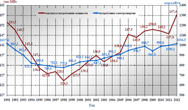 Рис. 3.1. Динамика изменения объемов электропотребления по стране и максимумов потребления мощности в 1991 – 2012 гг. Wпол.t = ∑Ппром.jt*qпром.jt+∑Пкомб.kt*qкомб.kt+∑Птр.ft*qтр.ft+Псхоз.rt*qсхоз.rt (3.2.) J k f r где: Ппром.jt -прогнозируемый объем производства промышленной продукции вида j в году t в натуральном либо стоимостном выражении; qпром.jt -нормативная величина расхода электроэнергии на производство единицы промышленной продукции вида j в году t (удельная энергоемкость, норматив удельного электропотребления); Пкомб.kt, Птр.ft, Птр.ft -прогнозируемые объемы производства продукции и услуг по подотраслям коммунально-бытового сектора (включая социальную сферу и прочие услуги) транспорта и сельского хозяйства в в году t в натуральном либо стоимостном выражении; qкомб.kt, qтр.ft, qсхоз.rt -соответствующие нормативы удельного электропотребления по подотраслям коммунально-бытового сектора, транспорта и сельского хозяйства в в году t; При использовании нормативного метода прогнозирования потребности в энергии важнейшее значение имеет возможность получения информации о перспективных объемах производства продукции по отраслям промышленности и по подотраслям коммунально-бытового сектора, транспорта и сельского хозяйства и о нормативах удельного электропотребления по отраслям и подотраслям. Основными источниками информации об объемах производства продукции по отраслям и подотраслям на прогнозируемую перспективу являются: - подразделения Минэкономразвития РФ, Минпромторга РФ, Минрегионразвития РФ, Министерства транспорта РФ, Министерства сельского хозяйства РФ; - плановые и экономические подразделения администраций субъектов РФ и крупных муниципальных образований; - подразделения стратегического планирования крупных компаний и предприятий; - отделы перспективного прогнозирования и планирования специализированных отраслевых проектных институтов и НИИ; - специализированные маркетинговые агентства и компании. Основными источниками информации о нормативах удельного электропотребления являются: - отделы перспективного прогнозирования и планирования и технологические отделы специализированных отраслевых проектных институтов и НИИ; - отделы и службы главного технолога (главного инженера) промышленных предприятий; Укрупнено указанные нормативы представлены в [20]. При использовании нормативов на перспективу, необходимо учитывать, что в связи с возможными изменениями в технологии производства отдельных видов отраслевой продукции и представления услуг величины нормативов могут корректироваться. Особое значение это имеет для нормативов производства энергоемкой продукции в черной и цветной металлургии, в нефтепереработке и нефтехимии, в химической и целлюлозно-бумажной промышленности и др. Информацией о возможных изменениях в технологиях производства располагают упомянутые выше подразделения отраслевых проектных институтов и НИИ и промышленных предприятий. Наряду с нормативным методом на уровне крупных регионов и страны в целом для прогнозирования полезного спроса на энергию на долгосрочную перспективу используются макроэкономические методы, основой которых являются регрессионные зависимости между величиной энергопотребления на ту или иную перспективу и прогнозируемыми макроэкономическими показателями, включая [22,26,46]: - ве