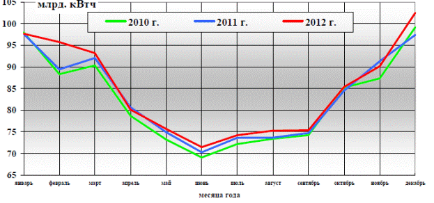 Представленная ниже на рис. 3.4. конфигурация годового графика месячных максимумов нагрузки, типичная для большинства ЭЭС в России, характеризуется максимальными нагрузками зимних месяцев – декабря и января и наличием сезонного летнего снижения («провала») нагрузок в июне-июле месяцах, используемого для преимущественного проведения плановых капитальных и средних ремонтов оборудования электростанций. В общем случае в зависимости от географического расположения, климатических условий и структуры потребителей в зоне ЭЭС годовой график нагрузки может существенно отличаться от приведенного выше. В частности, в странах с жарким климатом летний максимум нагрузки может быть выше зимнего из-за значительных нагрузок систем кондиционирования. В странах со значительными объемами осадков максимальные нагрузки могут иметь место в периоды работы систем осушения и т.п.