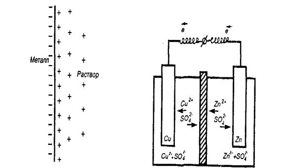 На границе металл–раствор возникает двойной электрический слой. Между металлом и раствором возникает разность потенциалов, которая называется электродным потенциалом или потенциалом электрода.