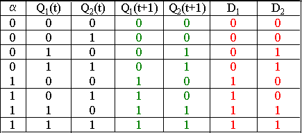 В ЭВМ на ряду с параллельным используется также последовательный способ представления двоичной информации, при котором код числа передается по одному каналу последовательно разряд за разрядом в дискретные моменты времени, задаваемые синхроимпульсами. Для приема и выдачи чисел, представленных в последовательном коде, и используются регистры последовательного действия, основу которых составляют регистры сдвига. Регистр сдвига осуществляет операцию сдвига записанного в него двоичного числа влево или вправо на один или несколько разрядов при подаче специального управляющего сигнала «сдвиг». Рассмотрим синтез двухразрядного сдвигающего регистра на D -триггерах. Регистр должен работать следующим образом: в момент прихода синхронизирующего сигнала С число сдвигается в регистре вправо на один разряд. При этом разряды числа, сдвигаемые вправо, поступают на выход регистра, а в освобождающиеся слева разряды вводятся разряды числа, поступившего в последовательном коде на его вход. Имеем следующую кодированную таблицу переходов и функции возбуждения (таблица выходов не строится, ибо выходами регистра являются выходы самих триггеров). Кодированная таблица переходов и функций возбуждения