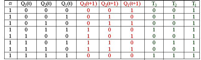 Лекция 9. Счетчики с одновременным, сквозным и групповым переносом Для ускорения процесса счета в счетчике необходимо, чтобы изменения состояний отдельных разрядов происходило не последовательно, а непосредственно вслед за приходом очередного сигнала счета. Как правило, такие счетчики строят на синхронных двухступенчатых Т -триггерах. При этом счетные сигналы подаются по шине a на синхронизирующие входы триггеров всех разрядов одновременно. Сигнал же на входе Т каждого триггера формируется логической схемой в зависимости от состояний всех триггеров счетчика. Синтез такого счетчика можно провести на основании кодированной таблицы переходов трехразрядного счетчика и таблицы функций возбуждения. Таблица
