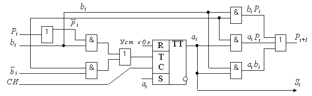При подаче синхроимпульсов в триггере образуется сумма Si, которая появится на выходе в момент окончания действия синхроимпульса. Если ai будет поступать в триггер в парафазном коде, то операция сложения будет выполняться за один такт: вначале такта в триггер поступает ai (СИ=0), а при СИ=1 поступают bi и Pi, т.е. такой сумматор обладает большим быстродействием по сравнению с сумматором накапливающего типа.