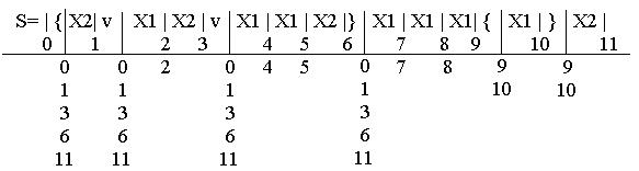В этом автомате сигнал y 1 выдается после поступления подряд 3-х букв x 1, а y 2 – после x 2, следующей за серией их 3-х и более букв x 1. В остальных случаях выдается буква e. Индексы основных мест записываются непосредственно под регулярными выражениями, а индексы предосновных мест располагаются ниже индексов основных мест, под горизонтальной чертой. Выражение имеет 12 основных мест (от 0 до 11). Проведем разметку предосновных мест. В начале определим, какие буквы может принять автомат, если он находится в состоянии 0. Поскольку на вход автомата может поступить любое из трех слов, записанных в итерационных скобках, то индекс 0 распространяется на каждое из трех предосновных мест, расположенных в начале этих слов. Учитывая, что событие, соответствующее выражению, записанному в итерационных скобках, содержит пустое слово е, индекс 0 распространяется на предосновное место, расположенное сразу за скобками. Это означает, что в частном случае ни одно из трех слов, заключенных в итерационные скобки, на вход автомата не поступит и тогда первой буквой, которую принимает автомат, является буква x 1, стоящая непосредственно за итерационными скобками. Таким образом, все эти предосновные места подчинены месту с индексом 0. Теперь найдем предосновные места, на которые распространяется индекс 1. Если автомат находится в состоянии 1, то он может принять букву x 2, расположенную слева от места 1, так как эта буква находится в итерационных скобках и, следовательно, неоднократно может повторяться во входном слове автомата. Кроме того, в состоянии 1 автомат может принять начальные буквы других слов, расположенных в итерационных скобках, и букву x 1, непосредственно следующую за этими скобками. Таким образом, месту с индексом 1 в данном случае подчиняются те же предосновные места, что и месту с индексом 0. Если автомат находится в состоянии 2, то он может принять только букву x 2, расположенную справа от места с индексом 2. Поэтому индекс распространяется на единственное пред основное место, являющееся одновременно основным местом 2. Аналогично можно найти подчиненные места других основных мест. По окончании слова, входящего в событие S, автомат переходит в состояние 11, после чего на вход автомата может поступить второе слово, этого события S, так как мы считаем, что автомат является автоматом многократного действия. Автоматами многократного действия называются такие автоматы, которые могут неоднократно принимать слова, входящие в события, представленные в автомате. В таких автоматах индекс конечного места распространяется на те же предосновные места, на которые распространяется индекс начального места, т.е. по окончании очередного слова на вход автомата этого слова может поступить вновь. По размеченному регулярному выражению теперь можно составить таблицу переходов автомата. Однако перед построением таблицы целесообразно уменьшить число индексов основных мест, а следовательно и число внутренних состояний автомата.