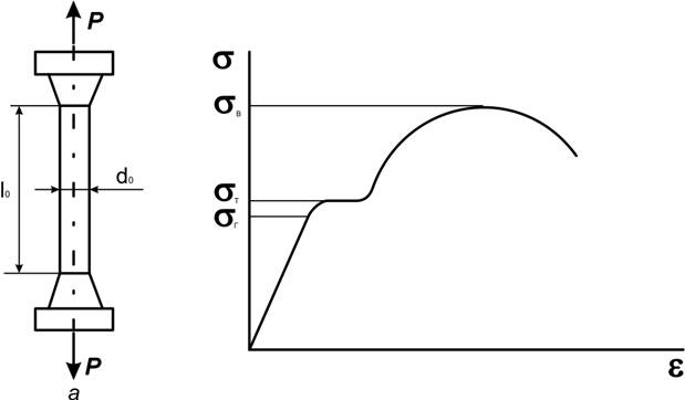 При статических испытаниях на растяжение определяют величины, характеризующие прочность, пластичность и упругость материала. Испытания производятся на цилиндрических (или плоских) образцах с определенным соотношением между длиной l0 и диаметром d0. Образец растягивается под действием приложенной силы Р (рис. 1,а) до разрушения. Внешняя нагрузка вызывает в образце напряжение и деформацию. Σ — это отношение силы Р к площади поперечною сечения F, Мпа: