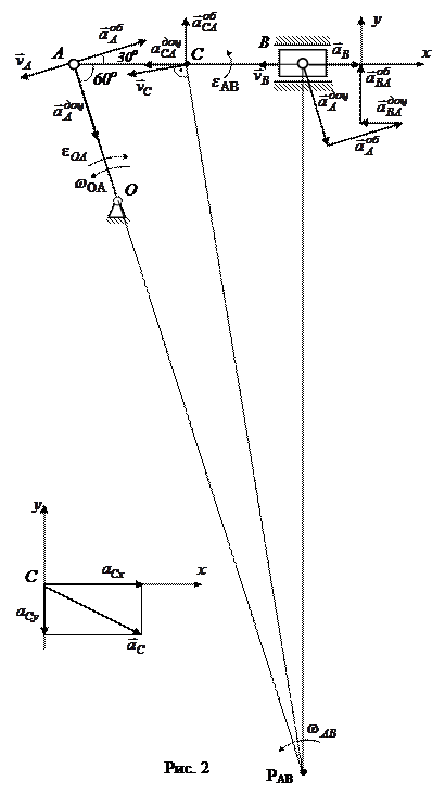 З рівності (2): З рівності (3): Кутове прискорення ланки АВ: Напрям прискорення Визначимо прискорення точки С: