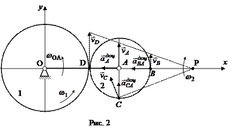 1. Визначення швидкостей точок В і С і кутової швидкості колеса 2 (рис.2). Знайдемо швидкості точок А і D: