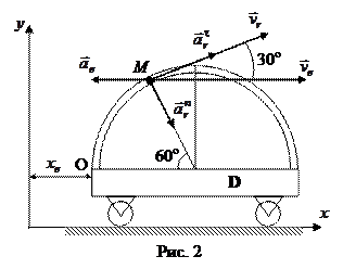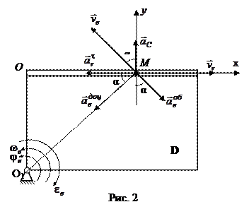 Розв’язання. Відносний рух точки – це криволінійний рух точки М по дузі кола радіуса R. Переносним рухом для точки М є прямолінійний поступальний рух тіла D уздовж осі х. 1. Визначимо положення точки М на тілі D в заданий момент часу. При t = 1 с Положення точки М показано на рис.2. 2. Визначення абсолютної швидкості точки М.