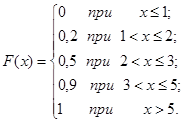 Пример 7.3. Непрерывная случайная величина Х задана плотностью распределения Найти: а) постоянный параметр С; б) функцию распределения F(x). Решение. А) плотность распределения f(x) должна удовлетворять условию б) для нахождения функции распределения F(x) используем формулу(7.2.). Если Если Следовательно, искомая функция распределения Задача 10. Дискретная случайная величина Х задана законом распределения (в первой строке таблицы приведены возможные значения, во второй – вероятности возможных значений). Требуется: а) построить многоугольник распределения; б) найти функцию распределения F(x) и построить её график; в) найти математическое ожидание, дисперсию и среднеквадратическое отклонение случайной величины Х.