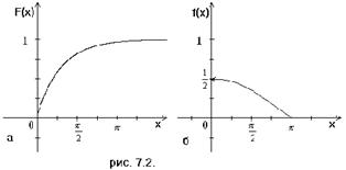Пример 7.2. Непрерывная случайная величина Х задана функцией распределения а) вероятность того, что в результате испытания Х примет значение, находящееся в интервале б) плотность распределения вероятностей f(x); в) математическое ожидание, дисперсию и среднеквадратическое отклонение случайной величины Х. Построить график функций F(x) и f(x). Решение. 1. Воспользуемся формулой 2. Плотность распределения вероятностей f(x) равна производной от функции распределения F(x): Поскольку все возможные значения случайной величины Х принадлежат интервалу (0; Дисперсию D(x) вычисляем по формуле (7.5.): Выполняя дважды интегрирование по частям, находим Окончательно получаем D(x)= Среднеквадратическое отклонение Построим графики функций F(x) и f(x) (рис.7.2.).