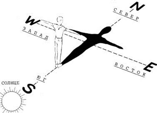 Компас. Походный компас представляет собой круглую коробку, сверху покрытую стеклом. В центре на острой игле вращается магнитная стрелка. Темный конец этой стрелки всегда показывает на север. На дне коробочки написаны буквы, обозначающие стороны света: север (N), восток (E), юг (S) и запад (W). (В южном полушарии магнитная стрелка указывает на юг). Часы. В солнечный день полуденную линию можно найти по часам. Повернув часы горизонтально, направь часовую стрелку на солнце и раздели расстояние между стрелкой (по ходу ее движения) и цифрой "13" (в России) пополам. Эта точка смотрит на ЮГ. Линия между этой точкой и центром часов будет полуденной.