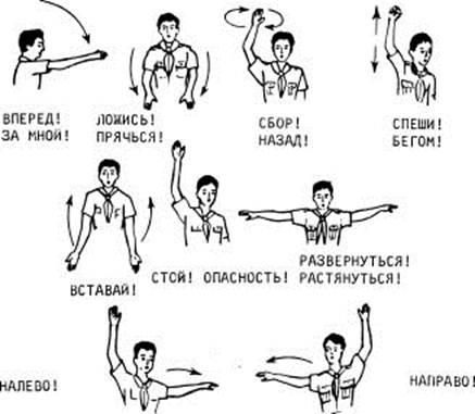 В походе, в лагере, да и вообще на протяжении всей скаутской жизни мы пользуемся сигналами, которые подаются свистком или руками. К ним ты привыкнешь на практике. Сигналы, производимые рукой, используются в походах и лесных играх. Это так называемые "немые команды". Главное их достоинство - бесшумность, а запомнить их нетрудно. Важно развить в себе наблюдательность, чтобы их сразу замечать. Основные из этих команд показаны ниже: