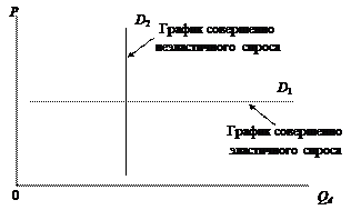 Здесь коэффициент ценовой эластичности спроса по формуле центральной точки равен 1, что является показателем единичного эластичного спроса на данном участке. При рассмотрении всей кривой спроса на данный товар можно отметить, что тип ценовой эластичности спроса различается на отдельных участках. Обычно на верхних участках графика при сравнительно высоких ценах и низких объемах спроса наблюдается эластичный спрос, на нижних отрезках при ином соотношении цен и объема спроса – неэластичный, а в какой-то точке между эластичными и неэластичными участками – единичный эластичный спрос. Кроме трех основных, существуют также два крайних типа эластичности: совершенно (абсолютно) эластичный спрос и совершенно (абсолютно) неэластичный спрос. При совершенно (абсолютно) эластичном спросе объем спроса увеличивается при неизменной цене, и коэффициент эластичности спроса равен бесконечности. При совершенно (абсолютно) неэластичном спросе изменение цены не ведет к изменению объема спроса, а коэффициент ценовой эластичности спроса равен 0 (рис. 6.6). В качестве примера совершенно эластичного спроса можно привести график спроса на продукцию чисто конкурентной фирмы, которая вынуждена продавать любое количество продукции по одной и той же цене, сформировавшейся на конкурентном отраслевом рынке (подробно эта рыночная ситуация будет рассматриваться в главе 9). Примером совершенно неэластичного спроса может служить часть графика спроса на товары, не имеющие заменителей, в частности на соль, объем спроса на которую в конкретном диапазоне цен будет одинаковым, так как потребность в ней ограничена определенным пределом, который нет смысла увеличивать при более низких ценах.