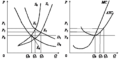 Рис. 9.8. Долгосрочное равновесие отрасли (а) и фирмы (б) Впоследствии изменение покупательских вкусов приведет к увеличению спроса на товар (сдвиг кривой спроса вправо из положения D0 в положение D1) и возникновению нового равновесия (точка Е1) при параметрах Q1 и Р1. Производители в условиях выросших цен начинают получать не только нормальную, но и экономическую прибыль (Р1 > АТС), которая становится стимулом для притока капитала из других отраслей и наращивания объемов предложения в действующих фирмах. В зависимости от размеров экономических прибылей, зарабатываемых действующими предприятиями, а также времени на освоение производства новыми фирмами процесс вхождения новых фирм может быть медленным или быстрым. В результате притока в отрасль новых фирм сформируется новое отраслевое предложение S1, и равновесная цена понизится до уровня Р2, при которой фирма по-прежнему будет получать экономическую прибыль при объеме Q2, хотя и в меньшем размере (см. рис. 9.8). Следует отметить, что в долгосрочном периоде при расчете прибыли рыночную цену сравнивают не с краткосрочными издержками фирмы, а с долгосрочными издержками отрасли (эта категория рассматривалась ранее). Через некоторое время продолжающееся увеличение предложения приведет к уменьшению цены до уровня долгосрочных средних издержек, т.е. экономическая прибыль исчезнет, и фирмы получат нормальную прибыль. Состояние равновесия наступит при уже большем объеме производства. Противоположная ситуация возникает в случае, когда убытки вынуждают фирму оставить отрасль. Предприниматель не может долгое время нести потери, и ему приходится либо свертывать бизнес, либо проводить мероприятия по снижению издержек. Отток фирм приведет к сокращению предложения отрасли (кривая переместится влево) и повышению равновесной цены. Выход предприятий будет продолжаться до тех пор, пока долгосрочные издержки не уравняются с рыночной ценой и у оставшихся в отрасли фирм не появится нормальная прибыль. Процесс приближения предприятий к идеальному состоянию долгосрочного равновесия происходит непрерывно под действием жесткого механизма совершенной конкуренции. Если в краткосрочном периоде фирма достаточно свободна в установлении оптимального объема производства, так как может управлять своими издержками, то в долгосрочном периоде она ориентируется на уровень долгосрочных отраслевых издержек. Это означает ужесточение ограничений, поскольку кроме рыночной цены фирма вынуждена учитывать еще и отраслевые издержки. Если они меньше рыночной цены, предприятие будет получать сверхприбыль, но этой прибылью придется делиться с фирмами-новичками. Если же цена упадет ниже долгосрочных издержек, то фирма самостоятельно понесет бремя потерь. Таким образом, механизм рыночной конкуренции диктует правила поведения фирм, нацеливая их на получение максимальной прибыли. При этом эффективность отдельной фирмы не должна быть ниже эффективности среднеотраслевой фирмы, иначе убытки приведут к потере или обесценению капитала, заставив ее выйти из отрасли. Поскольку единственным конкурентным преимуществом на таком рынке являются более низкие издержки, а лучшие конкурентные позиции занимают самые экономичные производители отрасли, то фирмы вынуждены эффективно использовать общественные ресурсы. Кр
