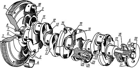 Коленчатый вал воспринимает через шатуны усилия, действующие на поршни, и передает их механизмам трансмиссии. От него приводятся в действие различные механизмы двигателя.