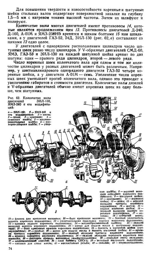 В заднем торце коленчатого вала двигателя ЗИЛ-130 сделана вы- точка, в которую запрессовывается шариковый подшипник 43 ведущего вала коробки передач. Такие же выточки для подшипников ведущего вала коробки передач или вала муфты сцепления имеются у коленча- тых валов двигателей ГАЗ-52 и ГАЭ-53.