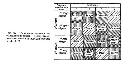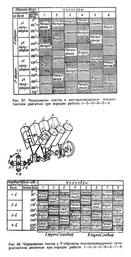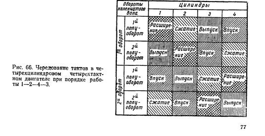 У двигателей Д-37Е, Д-50, Д-240, СМД-14, Д-160 и А-41 последо- вательность тактов расширения, т. е. порядок работы цилиндров 1—3— 4—2 (рис. 65), а у двигателей 24Д и ЗМЗ-451 1—2—4—3 (рис. 66).