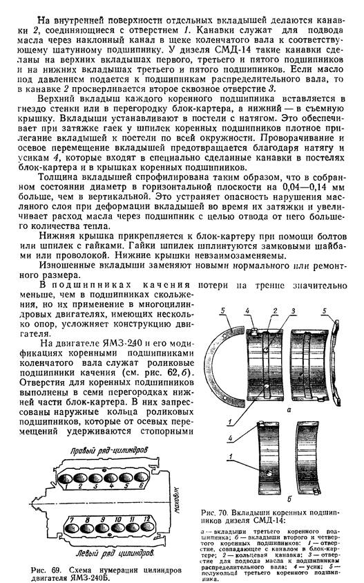 Верхние вкладыши коренных подшипников имеют сквозные отвер- стия 1 (рис. 70, а, б), которые при установке вкладышей в постели со- впадают с каналами в блок-картере. По этим каналам масло из глав- ной масляной магистрали подводится к подшипникам,