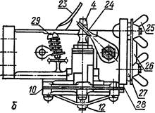 В корпусе смесительных камер имеется два патрубка. В каждом из них установлена дроссельная заслонка 16 и винт 17 регулировки соста- ва смеси при холостом ходе. Обе дроссельные заслонки жестко закреп- лены на одном валике. При помощи рычага 15 и тяги 14 валик дроссель- ных заслонок соединен с укорительным насосом.