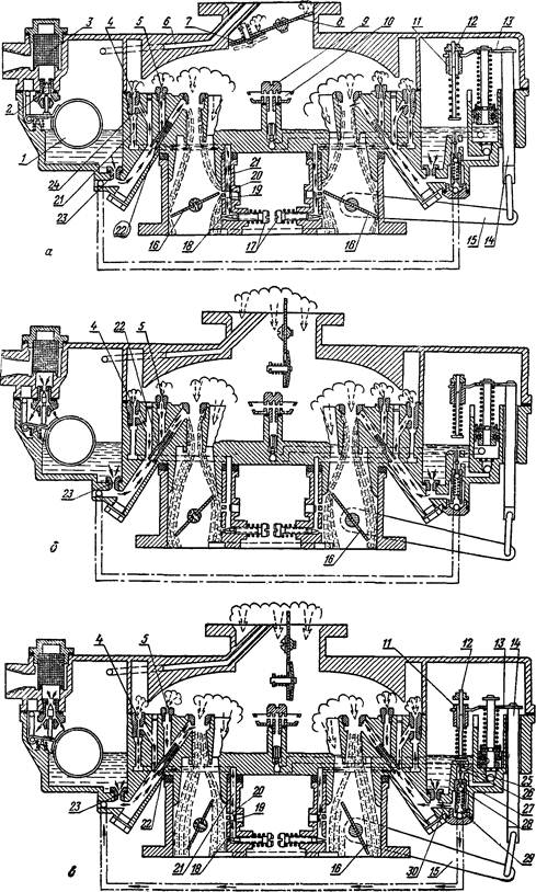 Работа карбюратора при включении экономайзера (рис. 118, в). По мере открытия дроссельных заслонок 16 рычаг 15 через тягу 14, планку 13 и шток 12 опускает толкатель 25. Поэтому клапан 28 отходит от сед- ла 27, и бензин через отверстие 26 и жиклер 29 экономайзера попадает в главный топливный канал 30, увеличивая количество бензина, пода- ваемого к жиклерам 22 полной мощности. По пути бензин смешивается с воздухом, поступающим через жиклеры 4 и 5 и входные отверстия 18, 19 и 20.