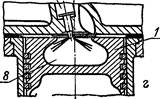 В неразделенных камерах сгорания (полусферических, тороидаль- ных и ЦНИДИ) количество топлива, распыливаемое в объеме воздуха, больше 7%, поэтому смесеобразование в них относится к объемно-пле- ночному. Оно обеспечивается кинетической энергией впрыснутого топ- лива и энергией воздушного заряда. В дизелях СМД-60 для создания интенсивного вихревого движения воздуха седла впускных клапанов имеют козырьки.