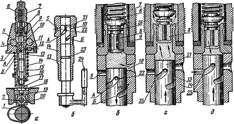 Винтовая канавка Б симметрична и противоположна канавке А. Они соединены диаметральным каналом 22. Наличие двух канавок вы- равнивает боковое давление на плунжер, и он изнашивается меньше.