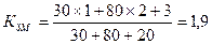 3. Коефіцієнт інтегрального використання основних фондів розраховується за формулою: Кінтег = Кекс За умовами нашого прикладу: Кінтег = 0,966 Задача 3.13 Обчислити коефіцієнт змінності роботи ткацьких верстатів у цеху, якщо 30 з них працює в одну зміну, 80 — у дві зміни, 20 — у три зміни. Розв'язання У даному випадку коефіцієнт змінності можна обчислити як середньозважену величину з числа одиниць устаткування на кількість змін його роботи: