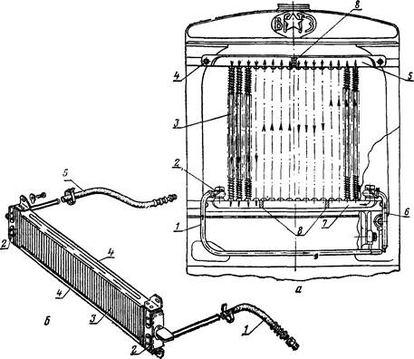 Масляный радиатор двигателя ГАЗ-5Э показан на рисунке 160, б. Он состоит из двух бачков 2 и планок 4. В бачки впаяно шесть латун- ных трубок, а к трубкам припаяны охлаждающие пластины 3. Масло поступает в радиатор по шлангу 5 из главной магистрали через пре- дохранительный клапан 3 (см. рис. 152, а) и охлажденное отводится по шлангу 1 (рис. 160,6). Конструкция масляных радиаторов двигате- лей ЗИЛ-130 и ГАЗ-52 такая же, как и радиатора двигателя ГАЗ-53.